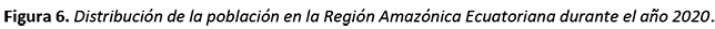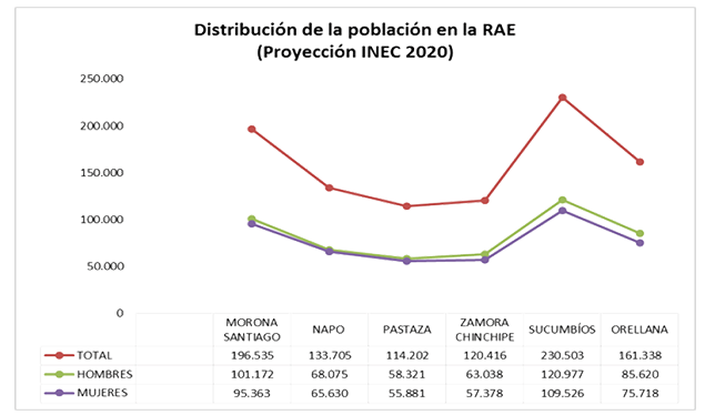 En la proyección de la distribución de la población de Ecuador el Instituto Nacional de Estadísticas y Censo (2020) refiere que el 51% de la población son mujeres y el 49% son hombres; por tanto, no hay diferencias significativas en los dos grupos poblacionales. Al revisar la distribución de la población en la Región Amazónica Ecuatoriana (RAE) se muestra que la provincia con mayor población es Sucumbíos y la de menor es Pastaza. En la totalidad de las provincias que conforman la RAE existe mayor cantidad de hombres, como se refleja en la figura 6.
