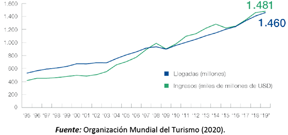 A partir del año 1950 es inminente el crecimiento del turismo internacional, así lo demuestran las estadísticas publicadas por la Organización Mundial de Turismo (OMT, 2019b), donde son notables los registros de flujos turísticos. Es por ello, que el turismo se convirtió en una de las actividades económicas con más rápido crecimiento en las últimas décadas; y por ende su aporte a las economías locales resulta de vital importancia para muchos territorios. Los datos históricos registraron en el año 1950 un movimiento de 25 millones de desplazamientos a nivel internacional tal y como se aprecia en la figura 1. Las previsiones de la Organización Mundial de Turismo indicaban llegar a los 1 800 millones de turistas al año 2030; lastimosamente la aparición del covid-19 generó un cambio en la dinámica de esta actividad, debido principalmente al cierre de aeropuertos, destinos turísticos y la crisis socioeconómica generada a nivel mundial. Debido a esta situación dicha organización habla de un optimismo cauteloso, y es en este contexto que se han realizado varias publicaciones con información concerniente a los impactos generados por la pandemia en el turismo a nivel internacional; donde se refieren a un retroceso de entre 5 y 7 años de crecimiento, o incluso un tiempo mayor.