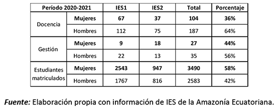 En el ámbito de la educación superior, la RAE cuenta con la presencia de dos instituciones públicas con sede matriz en este territorio, una en la provincia de Pastaza y otra en la provincia Napo; en la tabla 1 se presentan datos sobre la participación de la mujer en las funciones de docencia y gestión, así como la matriculación estudiantil en ambas instituciones.
