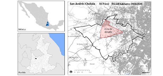 San Andrés Cholula es un municipio con 154 448 habitantes (Instituto Nacional de Estadística, Geografía e Informática, 2020) y forma parte de la zona metropolitana Puebla-Tlaxcala, que es una de las cuatro zonas metropolitanas más importantes del país2 (García, 2018). Actualmente, presenta una transformación urbana acelerada, realizada sobre territorio ejidal de la década de los noventa, impulsada con la implementación del Programa de Desarrollo Regional Angelópolis. Esto provoca diversos detonadores peri-urbanos como los cambios en las dinámicas poblacionales, especulación inmobiliaria, dispersión de localidades, abandono de las actividades agrícolas y consumo desmedido del territorio, entre otros. Lo que genera cambios en los patrones de uso de suelo que van desde los núcleos urbanos compactos hasta las localidades rurales dispersas a las nuevas centralidades urbanas (Heredia, 2018). Así, como lo plantea Tamayo (2020) se produjeron grandes impactos ambientales como la pérdida de suelo con alto valor ambiental y la explotación desmedida del agua.