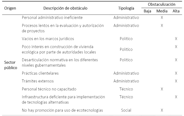 En la tabla 1 se observa que dentro de los obstáculos del sector público, más el 60% tienen un grado de obstaculización alta y se refieren a vacíos en los marcos jurídicos, falta de interés en construcción de viviendas ecológicas por parte de las autoridades locales, desarticulación en los diferentes niveles gubernamentales, prácticas clientelares, trámites extensos y falta de infraestructura; los cuales en su mayoría son de tipo político-administrativo. Analizando la tipología de los obstáculos con mayor grado de obstaculización en el sector público, se encuentra que el 50% son de tipo político y un 33% de tipo administrativo; indicando una deficiencia en la gestión administrativa, y a su vez revelando una gran necesidad de instrumentos normativos que disminuyan esta problemática.