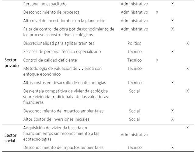 Mediante las entrevistas realizadas se identificaron los principales obstáculos para implementar ecotecnologías, los cuales se sistematizaron en la tabla 1, la cual se estructura en tres bloques, y estos a su vez en cuatro columnas. La primera columna indica el origen del sector del obstáculo (público, privado y social) en la segunda se describe brevemente el obstáculo o limitante, en la tercera se indica la tipología (administrativa, técnica, política y social) del obstáculo, y en la cuarta columna se realiza una valoración indicando el grado de obstaculización.