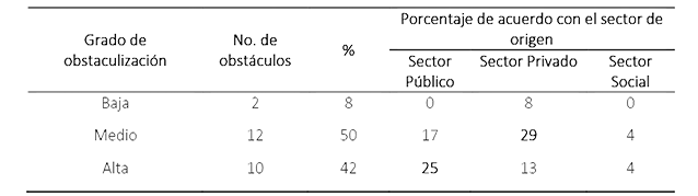 En la tabla 2 se observa que en el grado de obstaculización baja solo se encuentran dos obstáculos y corresponden al sector privado. En el grado de obstaculización medio aparecen 12 obstáculos, de los cuales la mayoría son del sector privado (29%); y en el grado de obstaculización alta se identificaron 10 obstáculos, de los cuales el 22% corresponden al sector público. De esto se desprende que la mayor obstaculización proviene, principalmente, del sector público y en segundo lugar del sector privado; lo que muestra la necesidad de realizar un análisis más detallado de los obstáculos contenidos en estos dos sectores para mejorar los procesos que faciliten la implementación de ecotecnologías.