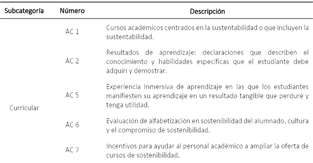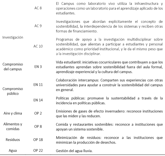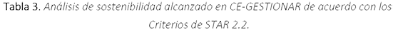 De manera exploratoria se analizó si CE-GESTIONAR cumple con los criterios de sostenibilidad integralmente en el ámbito universitario. Para ello se utilizó la descripción de categorías desarrolladas en el Sistema de Seguimiento, Evaluación y Calificación de Sostenibilidad (STARS 2.2) propuesto por la Asociación para el Avance de la Sostenibilidad en la Educación Superior (2019); que permite identificar la sostenibilidad en términos académicos, curriculares y de investigación, compromisos con el campus y públicos, la gestión de operaciones, entre otros. Los criterios seleccionados se muestran en la tabla 2.
