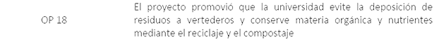 Es importante resaltar que el proyecto CE-GESTIONAR brinda un aporte integral, especialmente en el aspecto académico. En la línea curricular, gracias al trabajo de grado de las dos tesistas, se determinaron y documentaron hallazgos ambientales y de higiene y seguridad industrial, que pueden abordarse en lo adelante como un laboratorio práctico en cursos de auditoría ambiental. Se determinó por primera vez, localmente, la huella ambiental de una operación universitaria que genera gases de efecto invernadero (metano), producto de la descomposición de los residuos orgánicos en vertederos. Se ejemplificó la calificación de sostenibilidad de un campus universitario conforme a una métrica ambiental (UI GreenMetric) y se diseñó una propuesta de Sistema de Gestión Ambiental conforme a los criterios de la ISO 14001:2015 (Organización Internacional de Normalización, 2015); temas actuales que pueden promoverse como líneas curriculares y de investigación. Por tanto, el resultado de este espacio produjo varios insumos para la adecuada gestión operativa de las cafeterías, que enriquecen la dimensión académica (curricular).
