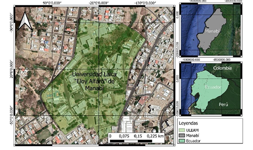La investigación se realizó en la sede de la Universidad Laica Eloy Alfaro de Manabí, ubicada en la ciudad de Manta, Ecuador (figura 1). Posee una extensión aproximada de 214 283 m2. Presenta varias infraestructuras civiles (edificios, calles, aceras, postes y cableado) y diversas áreas verdes de distintas características y variados fines. Además, es considerado uno de los espacios con mayor densidad arbórea de la ciudad.