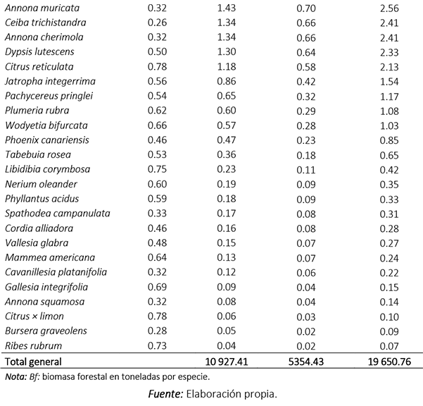 Para el análisis del secuestro de carbono la biomasa es un indicador importante, por lo tanto, estimar la biomasa en los árboles es el primer paso para contabilizar el carbono (Arroyave, 2018). En este sentido, se pudo estimar una biomasa forestal del arbolado de 7 825.58 t, lo que resultó en 5 354.43 t de carbono almacenado. A pesar de que la riqueza de especies arbóreas es amplia y que las densidades de madera varían según la especie, esta variable no se puede considerar como único criterio para analizar a las especies en diferentes grupos funcionales (Arroyave, 2018) y más bien será el conjunto de variables dendométricas, la abundancia de las especies y el estado fisiológico de estas lo que determine la capacidad para almacenar carbono del arbolado.