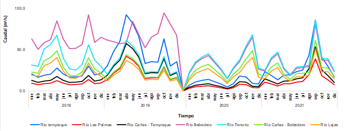 La subcuenca del río Tempisque, al tener un área mayor respecto a las demás subcuencas, sus caudales estimados (figura 5) fueron menores respecto a la subcuenca del río Tenorio que es la segunda con mayor área, indicando que esta subcuenca recibe menos entrada de agua anualmente. No obstante, en la subcuenca del río Cañas, al tener un área mayor de acuerdo con la cuenca del río Las Palmas, se evidenció la influencia del área, donde los aportes son superiores. Los caudales más altos registrados entre los cuatro años de análisis corresponden a la subcuenca del río Tempisque en el año 2019. Es apreciable la estacionalidad en los meses poco lluviosos y lluviosos, incidiendo en el caudal.