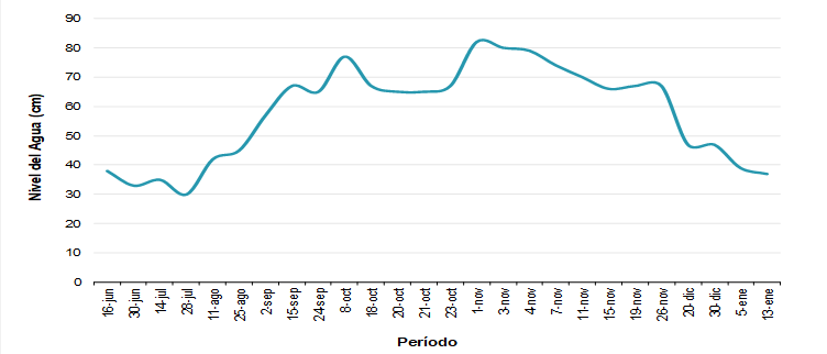 Como se observa en la figura 6, el registro comprende desde junio del 2023 hasta el mes de enero del 2024, niveles de mediciones que variaron de una fecha a otra, en su mayoría el nivel del agua en centímetros fue ascendiendo, considerando que las expediciones en gran parte se desarrollaron en la época lluviosa. El nivel de agua más alto fue el primero de noviembre, este se relaciona con la intensidad de lluvia que se presentó en la provincia de Guanacaste debido a la influencia indirecta de la tormenta tropical Pilar, aunado a las crecidas de los ríos de influencia al humedal. Además, en ese periodo también se presentaba marea alta en el Pacífico (Instituto Meteorológico Nacional, 2023).