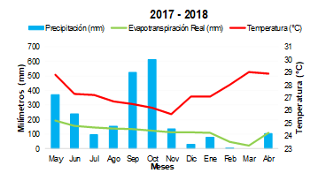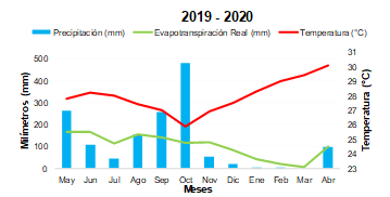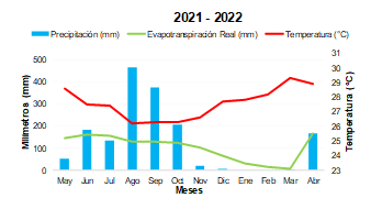 Por otro lado, se observa que la temperatura no varía considerablemente de un mes a otro, no obstante, las precipitaciones son muy marcadas debido a la estacionalidad que posee el área objeto de estudio. Tras realizar un análisis de correlación entre las variables temperatura y evapotranspiración, se determinó que existe relación directa entre ellas, ya que, en los meses con temperaturas más elevadas se presenta la tasa de evapotranspiración más alta, cuyas características se visualizan de mejor manera en la época poco lluviosa, un ejemplo específico es el mes de marzo del 2021. De igual manera se observa en la época lluviosa del 2020, donde la evapotranspiración más alta se registró en el mes más cálido, cuyo reflejo es mayo.