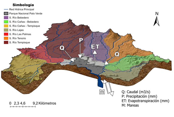 Al ubicarse el humedal en la desembocadura de dos cuencas hidrográficas importantes para la región Chorotega se obtuvieron las subcuencas delimitadas, estas aportan un determinado caudal (Q) de entrada a través de sus afluentes, es decir, agua superficial que llega a incidir en el sistema. De igual manera, está la influencia directa de la precipitación (P), tomada de la estación meteorológica Los Negritos, luego se observa tanto la entrada como la salida de mareas (M) provenientes del Golfo de Nicoya. Con respecto a esta última, mediante expediciones de campo realizadas en la desembocadura del río Tempisque, así como la visita a puerto Chamorro, se corroboró que la dirección de la corriente del río se rige de acuerdo con la entrada de las mareas, teniendo incidencia en las partes aledañas al manglar.