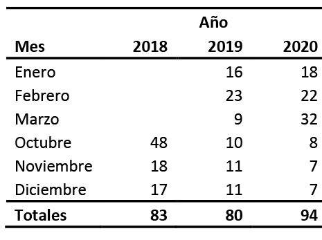 Tabla 2. Cantidad de mensajes emitidos en el grupo de Whatsapp por día, en los meses monitoreados