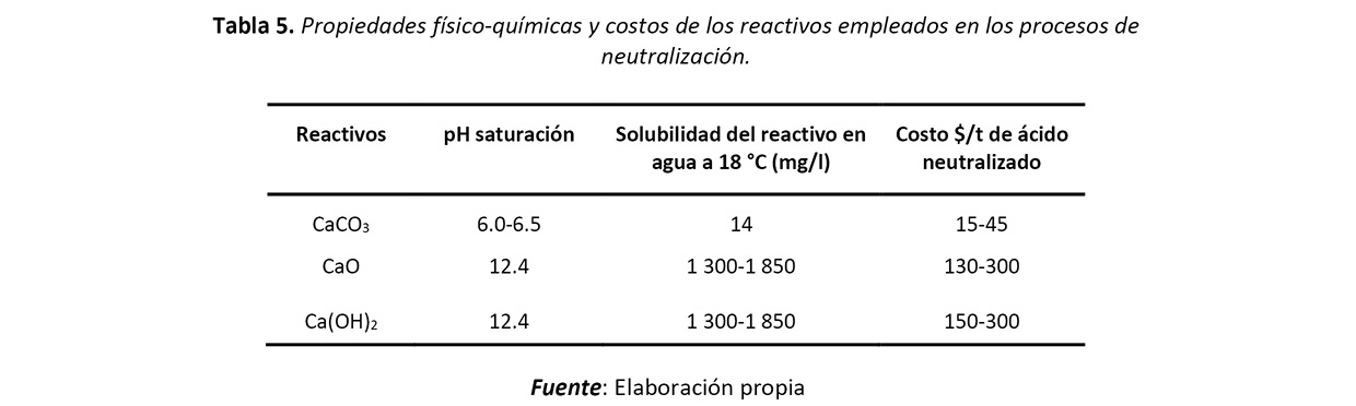 En la tabla 5 se presentan las propiedades físico-químicas y los costos de los diferentes agentes neutralizantes empleados en las pruebas, para ofrecer criterios de selección en la propuesta tecnológica a implementar por los responsables de efectuar las medidas de remediación.