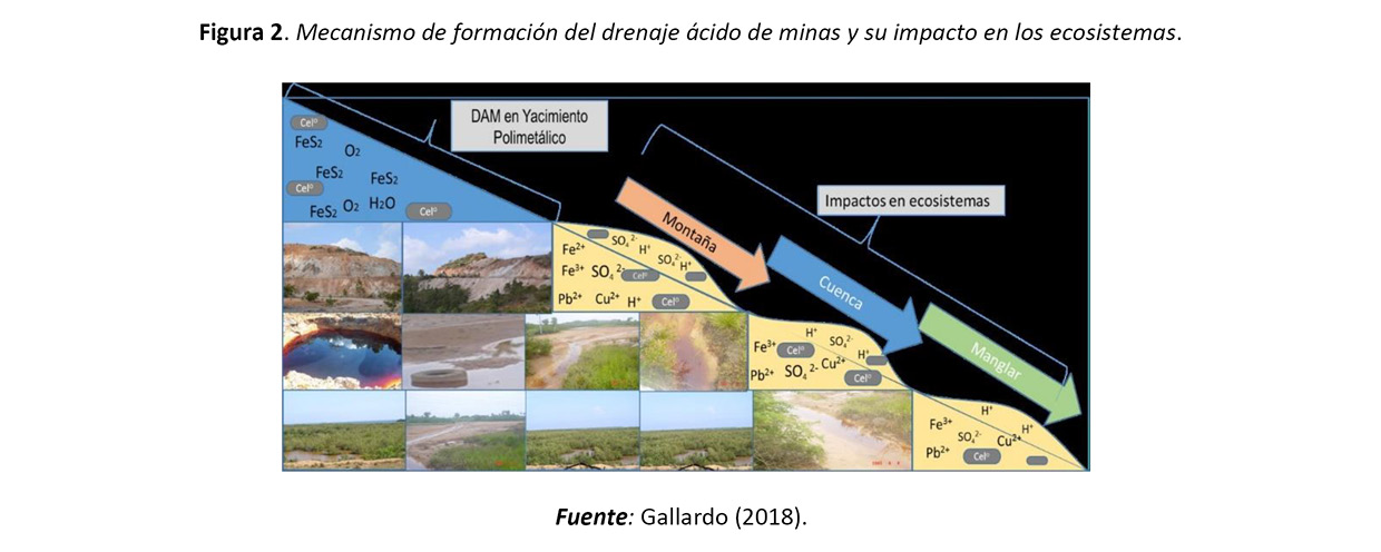 El drenaje ácido de mina, generado en actividades mineras de yacimientos de sulfuros metálicos, causa grandes problemas ambientales por su alto potencial de contaminación para los recursos hídricos superficiales y subterráneos. Se caracteriza por sus bajos valores de pH y un alto contenido en mg/l de sulfatos y metales —hierro (Fe), aluminio (Al), manganeso (Mn), zinc (Zn), cobre (Cu), plomo (Pb), mercurio (Hg), cadmio (Cd), níquel (Ni)—, nocivos para los ecosistemas (Gallardo et al., 2016).