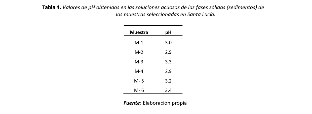 En la tabla 2 se muestran los resultados de los análisis químicos mayoritarios de las muestras tomadas. En la muestra de roca primaria M-1 se refleja el quimismo característico de las menas pirito-polimetálicas de Pb, Zn y Ba, de Santa Lucía. El resto de las muestras presentan la composición química típica de los sedimentos formados durante la intensa contaminación ácida existente. Estos análisis evidencian la contaminación de la región, producto a la exposición de los yacimientos por largos periodos de tiempo.