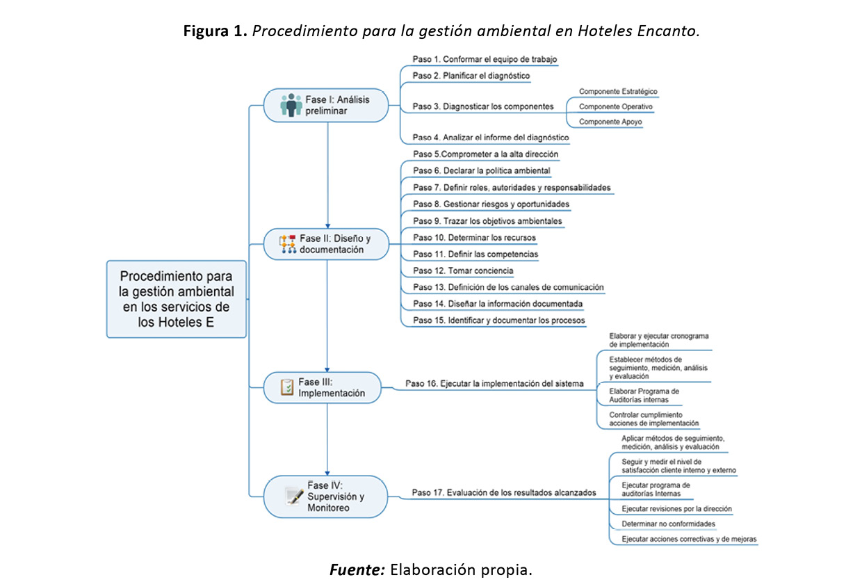 Teniendo en cuenta que existen diferentes elementos para el diseño e implementación de sistemas de gestión ambiental, se respetó que el procedimiento diseñado tuviera un enfoque sistémico y participativo; que incluyera las dimensiones de la gestión ambiental con los componentes principales y las variables necesarias para lograr una concepción más pertinente y actual, y que a su vez permitiera su integración a los retos propios que enfrenta la marca de Hoteles Encanto, la cual debe armonizar la gestión hotelera con la conservación de la infraestructura constructiva, la preservación del entorno donde se encuentren enclavadas sus instalaciones, y el cumplimiento de las exigencias ambientales a nivel de país; por ello resulta primordial la existencia de un procedimiento que facilite tal interacción.