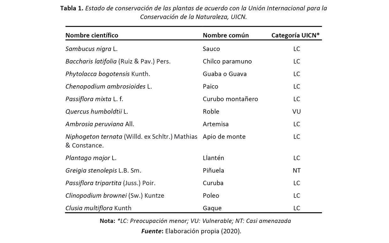 En cuanto al estado de conservación, 11 especies se encuentran en la categoría de preocupación menor (LC), una en vulnerable (VU) y una casi amenazada (NT) (Bernal et al., 2019). Su estado de conservación no se ha evaluado; sin embargo, los usos reportados para las mismas están relacionados con la protección de la cuenca, de manera que no se espera afectación sobre las poblaciones locales (tabla 1).