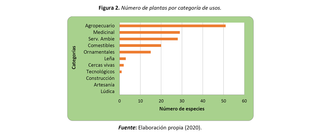 Con respecto a los usos reportados (figura 2), se encontró que el mayor de ellos está asociado a la categoría de uso agropecuario con 51 especies, seguido por medicinal con 29 y servicios ambientales con 28 especies. La categoría de uso agropecuario es la de mayor relevancia en el estudio y esto viene dado por las actividades propias de la zona, donde las actividades económicas son las agrícolas y las pecuarias, principalmente.