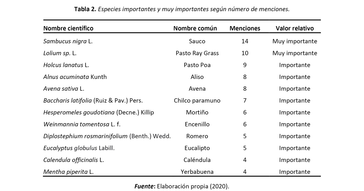 De acuerdo con los criterios establecidos por Aranguren (2005), la información mostró 70 especies raras (71 %), 26 importantes (26 %) y dos muy importantes. El sauco (S. nigra L.) es la especie con mayor importancia relativa con 14 menciones, seguida por Lolium sp. L. con 10 menciones. Dentro de las especies importantes se destacaron H. lanatus L., A. sativa L., y las especies protectoras de la cuenca como el Alnus acuminata Kunt, B. latifolia (Ruiz & Pav.) Pers., H. goudotiana (Decne.) Killip y Weinmmannia tomentosa L. f., las cuales son nativas de la zona.