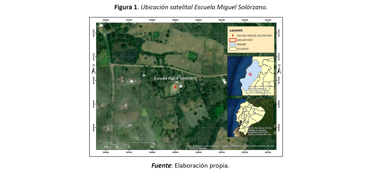 El trabajo se realizó en la Escuela Miguel Solórzano del sitio Bravos Grandes, en las coordenadas 594903.10 E y 9930968.93 S (parroquia San Antonio, Manabí, Ecuador). En esta zona rural, la actividad agrícola es predominante, destacándose los cultivos de maíz, plátano, yuca y maracuyá (figura 1); la aplicación de agrotóxicos se realiza durante la época lluviosa en la fase inicial (siembra) y la fase intermedia (floración).