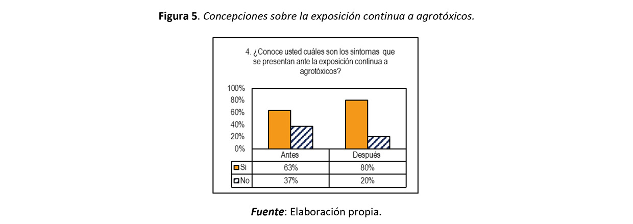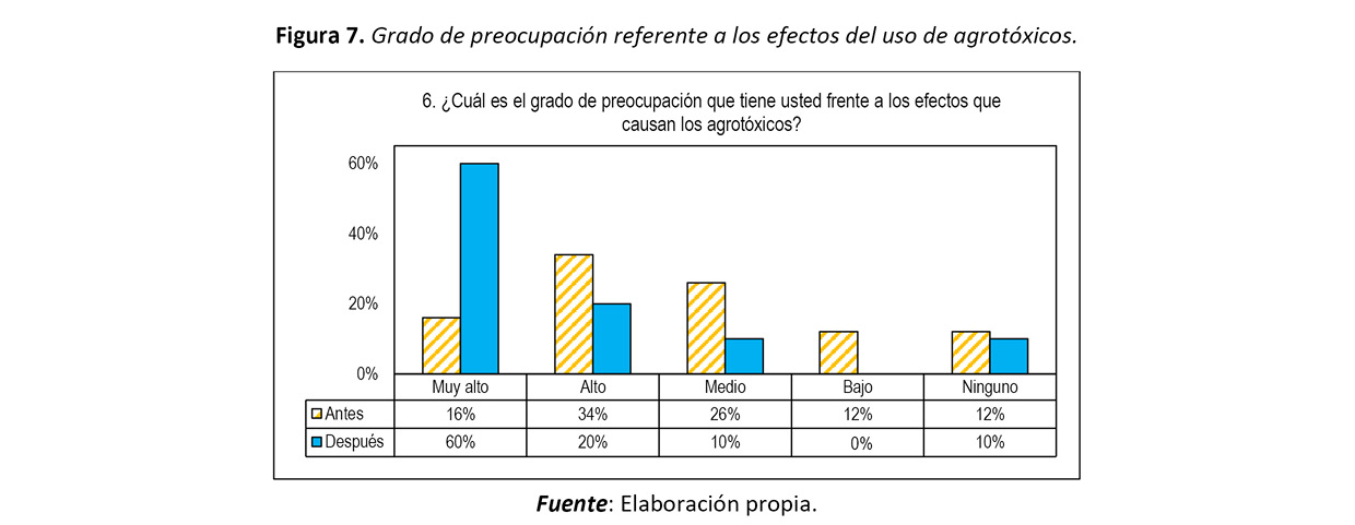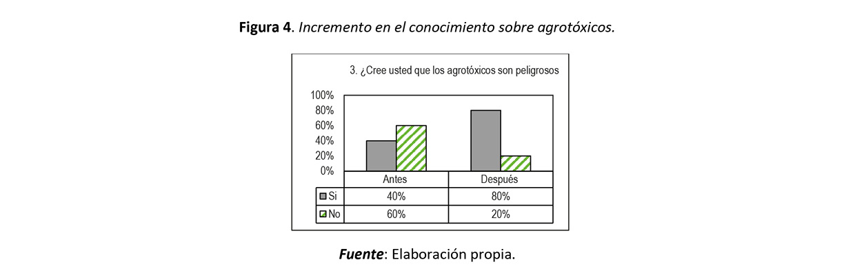 Antes de aplicar la estrategia, el 40 % de los encuestados desconocía los daños que los agrotóxicos pueden causar a la salud. Después de ejecutar la estrategia el 80 % aseguró que sí pueden provocar efectos nocivos (figura 4). Tal como sugieren Elahi et al. (2019), la producción social de riqueza va acompañada sistemáticamente por la producción social de riesgos, por lo cual, la sociedad del riesgo comienza donde falla la seguridad en los sistemas de normas sociales, en relación con los peligros desatados por los riesgos sociales, ecológicos, políticos e individuales.