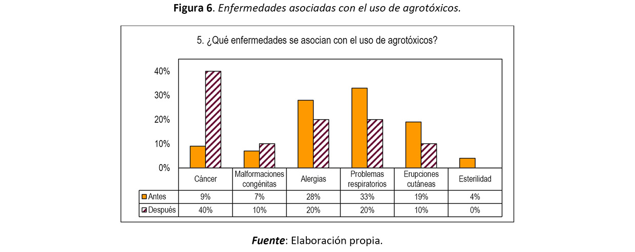 Después de aplicarse la estrategia, se evidenció un cambio de percepción en cuanto a las enfermedades que pueden provocar los agrotóxicos, pues del 9 % de las personas que consideraban que los agrotóxicos pueden provocar cáncer, aumentó a un 40 %. Con respecto a las malformaciones congénitas, el 7 % consideraba que estos productos tienen incidencia en esa enfermedad, pero en la actualidad el 10 % lo afirma. En cuanto a las demás enfermedades consideradas en esta pregunta, las cifras bajaron considerablemente debido a que la mayoría de las personas encuestadas mencionaron la relación de esas sustancias con el cáncer (figura 6).