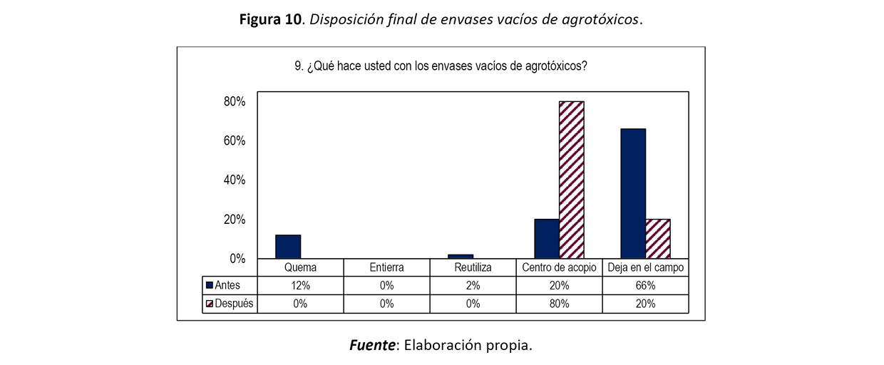 Respecto de la disposición final de envases de agrotóxicos (figura 10), el 80 % de las personas afirma entregar los envases vacíos en un centro de acopio, también se pudo constatar que del 66 % que los dejaba en el terreno, aún hay un 20 % que lo hace; por otro lado, también se redujo la quema de estos (de 12 % a 0 %).