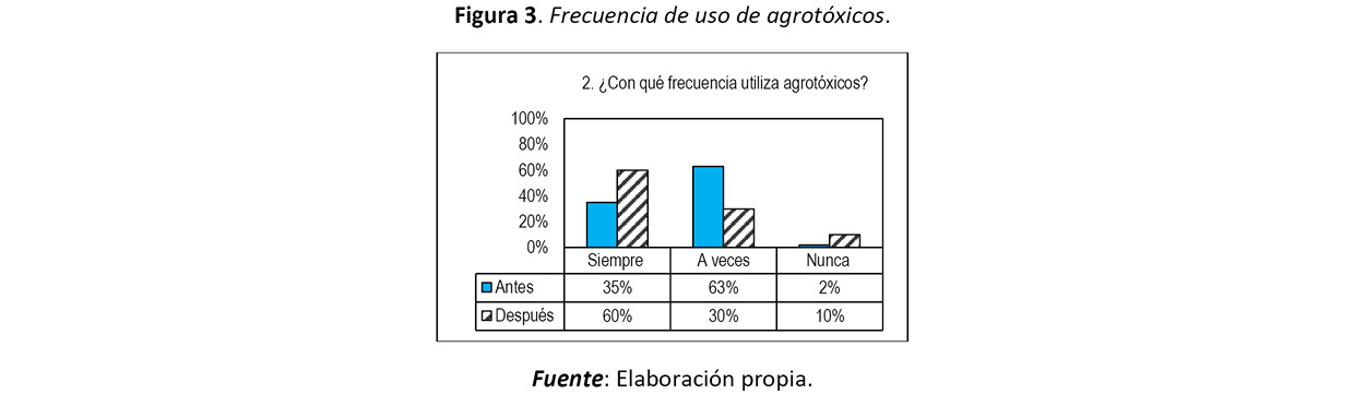 En cuanto a la frecuencia de uso, después de aplicarse la estrategia de educación ambiental, el 60 % de los participantes respondió que siempre utiliza agrotóxicos, el 30 % (5 % menos) afirma que a veces lo utiliza y el 10 % que nunca lo hace (figura 3). Estos resultados se relacionan con el estudio realizado por García (2012) en el cual se detalla que un 67 % de los agricultores utilizan agrotóxicos dos veces al año, hecho vinculado a su empleo en la producción de alimentos que se obtienen en la comunidad de estudio.