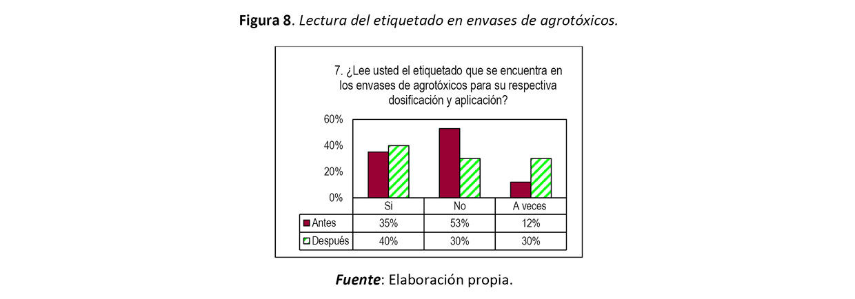 Antes de aplicar la estrategia solo un 16% de los encuestados presentaba un grado de preocupación muy alto frente al efecto de los agrotóxicos; sin embargo, después de ejecutar la estrategia este porcentaje subió al 60 %. No obstante, un 10 % de los encuestados afirmó no tener ninguna preocupación sobre dicho efecto a pesar de que los agricultores mencionaron que se han dado varios casos de intoxicaciones (figura 7). Aunque ya existe evidencia del vínculo de ciertos agrotóxicos con diversas enfermedades, resulta prácticamente imposible aseverar los padecimientos específicos que se deban al uso o contacto con estas sustancias (Hidalgo et al., 2016).Actualmente, el 40 % de los encuestados leen las etiquetas (5 % más que antes). Es importante señalar que el 30 % de los moradores leen el etiquetado a veces; pues lo consideran innecesario (figura 8). García (2012) afirma que, en su gran mayoría, los agricultores no leen las indicaciones al utilizar agrotóxicos y, en caso de hacerlo, no aplican lo sugerido en las etiquetas, pues sus prácticas agrícolas se basan en los resultados que esperan obtener y para esto suelen pensar que, a mayor cantidad de agrotóxico, mejor será el efecto de estos.